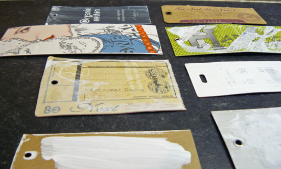 A pile of gesso'ed clothing tags, inspired by Julie's project. Someday I will get around to transforming into a miniature art journal full of insightful quotes.. just not quite sure when.