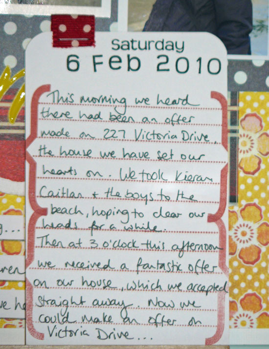 I felt moved to do some scrapping this afternoon and produced this.. so that I will never forget how I'm feeling today.. the day before a potentially HUGE turning point in our lives. The journaling tells the story in a nutshell.Terrible lighting, so here's a couple of close-ups..