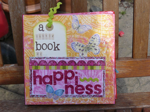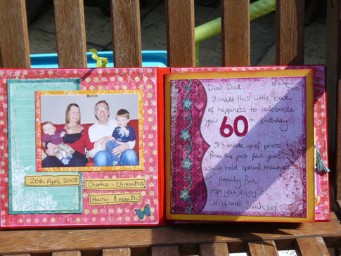 Today is my Dad's 60th birthday (Happy Birthday Dad!!!)... as part of his present I made a little mini-book called 'A little book of happiness'. It's filled with photos of Dad, Mum, Charlie and Harry during our holidays in Wales and their visits to us. It was fun to make and also busted a bit of stash!